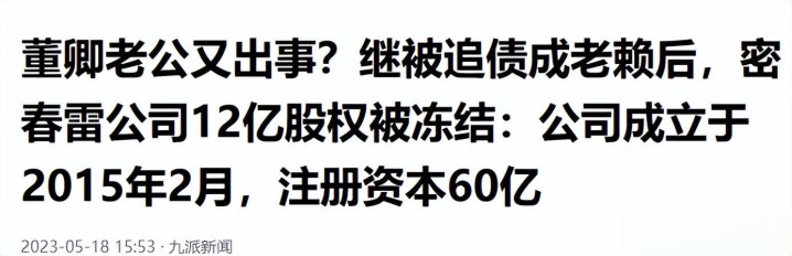 九派新闻《董卿老公又出事?继被追债成老赖后,密春雷公司12亿股权被冻结:公司成立于2015年2月,注册资本60亿?》发布时间:2023.5.18
