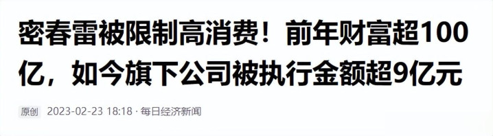 每日经济新闻《密春雷被限制高消费!前年财富超100亿,如今旗下公司被执行金额超9亿元》发布时间:2023.2.23